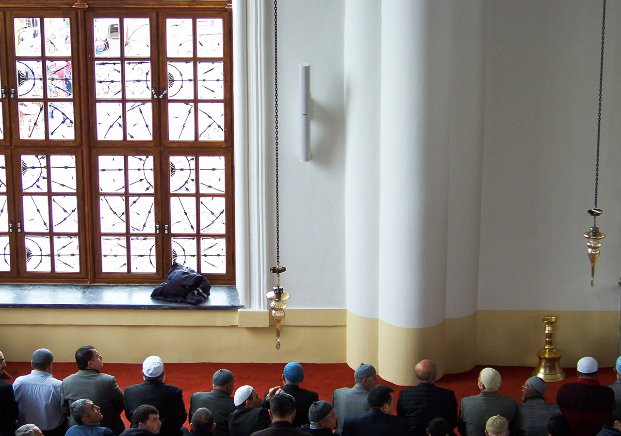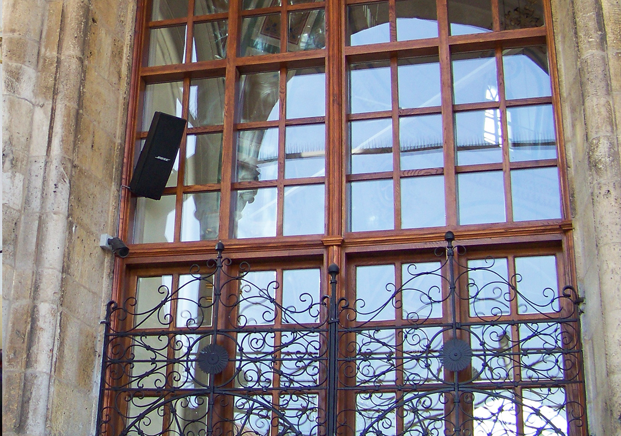 Modern çizgilerin minimumda tutulması gereken bu tarihi camiide ince uzun profilli kolon tipi hoparlörler kullanılmıştır. İçlerinde üst üste konumlandırılmış sürücülerle uzun mesafelerde efektif ses dağılımı yapabilen bu hoparlörler sayesinde hoparlör sayısı minimuma indirilebilmiştir. Mesafe ikiye katlandıkça standart hoparlörler 6dB kayba uğrarken, bu hoparlörlerde sadece 3dB kayıp yaşanmaktadır. Camiinin dışında ibadetini gerçekleştiren cemaat için ise her türlü hava koşuluna dayanıklı dış mekan hoparlörleri kullanılmıştır.